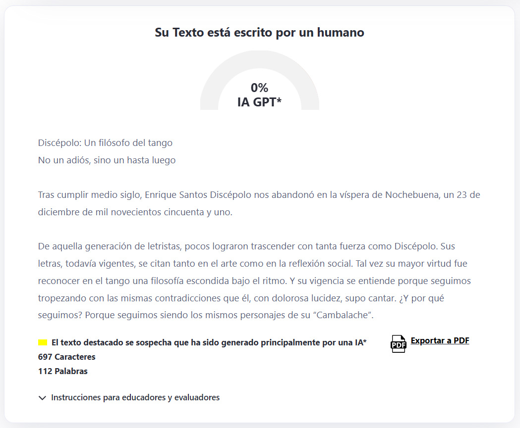 De aquella generación de letristas, pocos lograron trascender con tanta fuerza como Discépolo. Sus letras, todavía vigentes, se citan tanto en el arte como en la reflexión social. Tal vez su mayor virtud fue reconocer en el tango una filosofía escondida bajo el ritmo. Y su vigencia se entiende porque seguimos tropezando con las mismas contradicciones que él, con dolorosa lucidez, supo cantar.